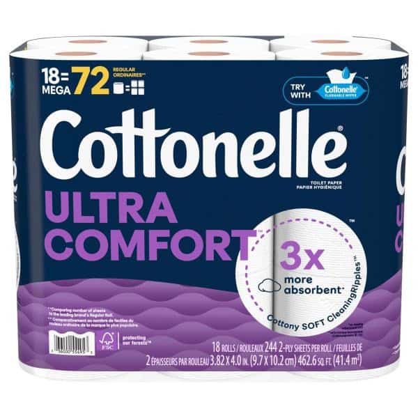 • 18 Mega Rolls of Cottonelle Ultra Comfort Toilet Paper; 244 sheets per roll; Cottonelle toilet paper packaging and product may vary