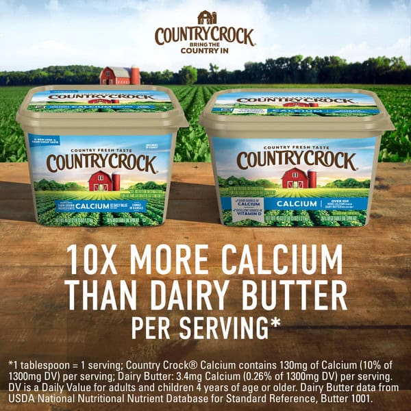 Ready to use right out of the fridge, Country Crock Calcium Buttery Spread can be spread on top of your favorite breads and pastries for a deliciously decadent buttery treat. Use it as a secret ingredient to add depth of flavor and richness to your cooking and baking favorites from appetizers to main dishes, desserts, and more. Country Crock Calcium is free of gluten, hydrogenated oils, dairy, and lactose, has 0g cholesterol and trans fat per 1 tbsp serving, and has 75% less saturated fat than a 1 tbsp serving of traditional dairy butter.