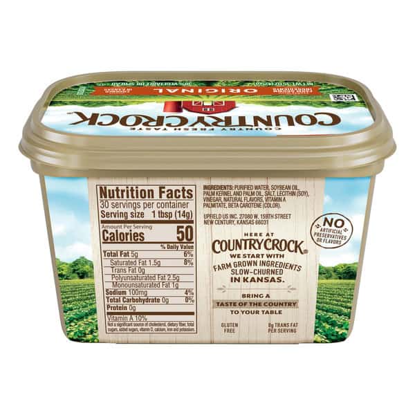 Bring authentic, country-fresh flavor to the table with Country Crock Original Buttery Spread Tub – 15 oz. This buttery spread is rich, creamy, and delicious. Slow-churned in Kansas and carefully crafted with farm-grown ingredients, you can always count on Country Crock to be free of any artificial flavors and preservatives. There’s a reason Country Crock has been a trusted favorite at the center of family tables for generations!