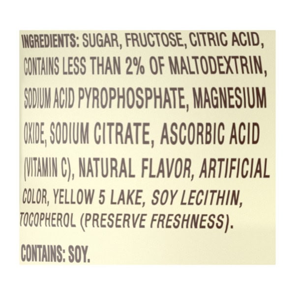 Sugar, Fructose, Citric Acid, Contains Less Than 2% Of Maltodextrin, Sodium Acid Pyrophosphate, Magnesium Oxide, Sodium Citrate, Ascorbic Acid (vitamin C), Natural Flavor, Artificial Color, Yellow 5 Lake, Soy Lecithin, Tocopherol (preserve Freshness)