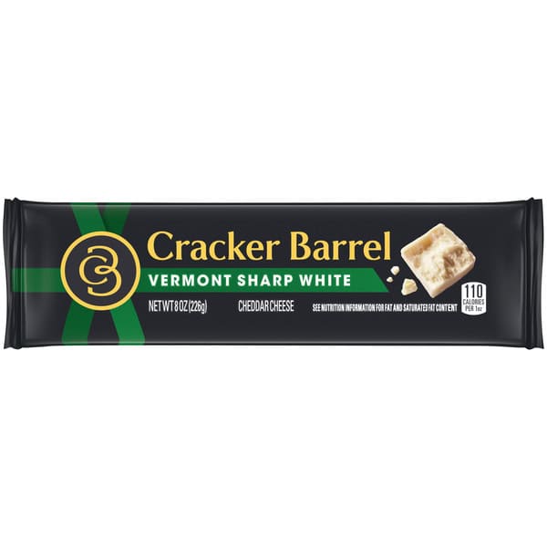 Cracker Barrel Vermont Sharp White Cheddar Cheese Block is an East Coast cheddar with a complex, full flavor that’s perfect for entertaining family and friends. The white cheddar cheese block contains 110 calories per serving and is made with milk for a creamy textured treat. Add it to an appetizer tray along with black pepper crackers, prosciutto, pine nuts and strawberries to keep guests content. Pair this Vermont cheddar with a sweet Riesling for an exquisite flavor combination. This extra sharp cheddar cheese comes in a convenient block that’s great for slicing and serving. Each 8 ounce wrapped cheese block includes 8 servings., ● One 8 oz Cracker Barrel Vermont Sharp White Cheddar Cheese Block, ● Cracker Barrel Vermont Sharp White Cheddar Cheese Block from the makers of world champion cheese, ● An East Coast cheddar cheese with a complex, full flavor, ● Cheddar cheese block is perfect for slicing and serving, ● Ideal for snacking or entertaining family and friends, ● Wrapped cheese block contains 8 servings, ● 110 calories per serving