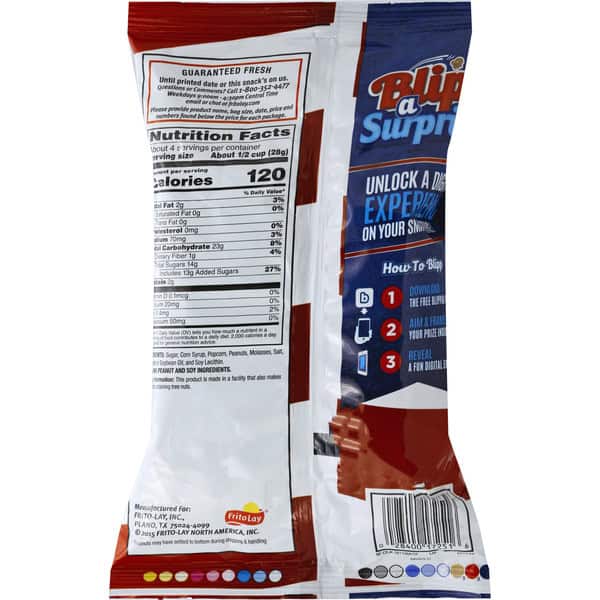 New prize inside! See back for details. Unlock a digital experience on your smartphone. How to Blipp: 1. Download the free Blipp app. 2. Aim & frame your prize inside. 3. Reveal a fun digital experience. Guaranteed fresh until printed date. Guaranteed fresh until printed date or this snack’s on us. Questions or comments? Call 1-800-352-4477 weekdays 9:00am – 4:30pm Central Time. Email or chat at fritolay.com. Please provide product name, bag size, date, price and numbers found below the price for each package. Peanuts may have settled to bottom during shipping & handling.
