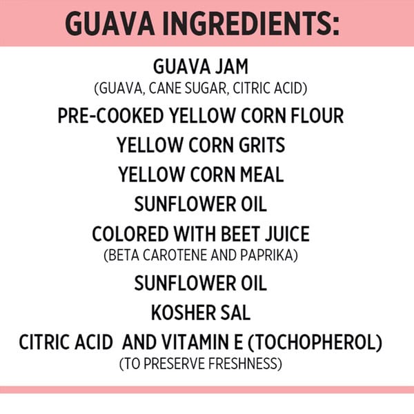 Guava Jam (guava, Cane Sugar, Citric Acid), Pre-cooked Yellow Corn Flour, Yellow Corn Meal, Colored With Beet Juice, Beta Carotene And Paprika, Sunflower Oil, Kosher Salt, Citric Acid And Vitamin E (tocopherol) To Preserve Freshness.