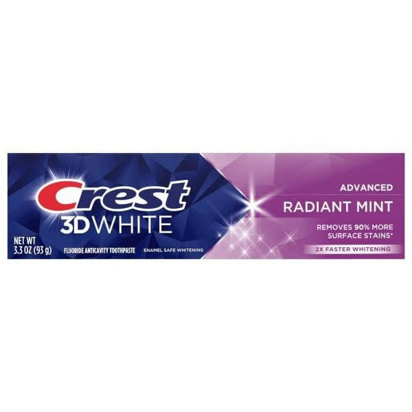 Brighten your smile with Crest 3D White Advanced Radiant Mint Whitening Toothpaste. This Crest toothpaste removes 90% more surface stains*, protects against future stains, and starts whitening your teeth after 1 brush. This 3D White toothpaste also strengthens your tooth enamel and helps protect teeth against cavities. It leaves your smile with a bright and minty- fresh feeling. *Vs. regular toothpaste. From America’s #1 Whitening Brand* *P&G calculation based on U.S. reported sales data for yr ending w/o 6/11/2022