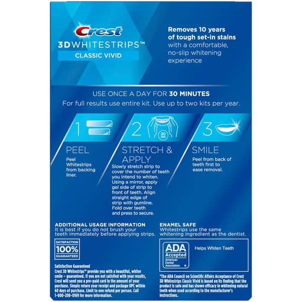 Want a whiter smile at home? Choose Crest 3DWhitestrips from the #1 dentist-recommended at-home teeth whitening brand. Get a brighter, whiter smile in just 10 days with Crest 3DWhitestrips Classic Vivid. This 30-minute teeth whitening treatment makes it easy to whiten teeth without leaving the house. It has been accepted by the American Dental Association and uses the same enamel safe teeth whitening ingredient as dentists. Try the Vivid White teeth whitening kit and get 100% noticeably whiter teeth, guaranteed. Plus, the Advanced Seal Technology’s comfortable, no-slip grip stays put, so you can talk and drink water and chat with friends even while whitening your teeth. Simply apply Crest 3DWhitestrips Classic Vivid for 30 minutes a day for 10 days. This pack includes 20 teeth whitening strips, 10 for your top teeth and 10 for your bottom teeth, to be used over the course of 10 days.
