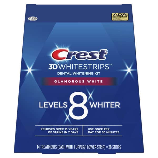Crest 3DWhitestrips Glamorous White removes over 15 years of stains with a comfortable, no-slip teeth whitening experience. The Advanced Seal Technology’s no-slip grip means the strips stay put until you take them off, allowing you to talk and even drink water while whitening your teeth. Choose Crest 3DWhitestrips Glamorous White from the #1 dentist-recommended at-home teeth whitening brand and get noticeably whiter teeth, 100% guaranteed. It has been accepted by the American Dental Association and uses the same whitening ingredient as dentists. This enamel-safe, at-home teeth whitening kit will make your smile 8 levels whiter. Simply apply Crest 3DWhitestrips Glamorous White for 30 minutes a day for 14 days. This pack includes 28 teeth whitening strips, 14 for your top teeth and 14 for your bottom teeth, to be used over the course of 2 weeks.