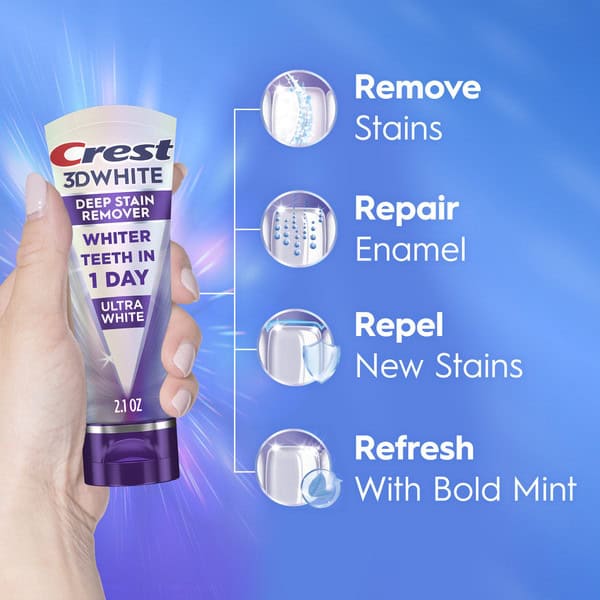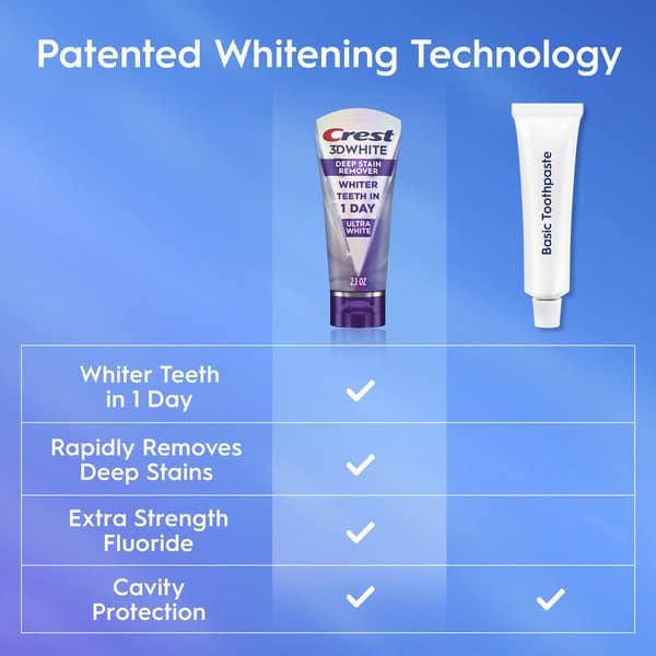 The latest breakthrough in whitening technology is here. Crest 3DWhite Brilliance Deep Stain Remover is the first of its kind: an everyday toothpaste that actually delivers on whitening. In just one day, it dissolves the bonds that hold even deep stains to teeth, for ALL-AROUND whiter teeth. From the #1 teeth whitening brand in America.