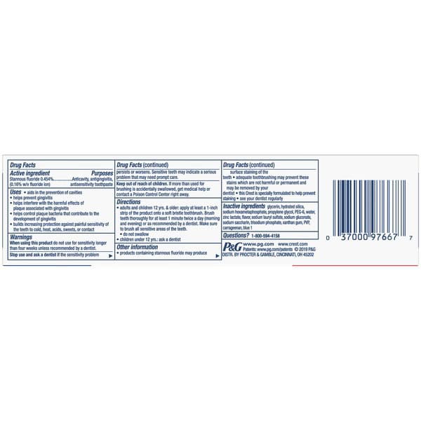 WHEN USING THIS PRODUCT do not use for sensitivity longer than four weeks unless recommended by a dentist. Other information. WARNINGS. KEEP OUT OF REACH OF CHILDREN. If more than used for brushing is accidentally swallowed, get medical help or contact a Poison Control Center right away. • products containing stannous fluoride may produce surface staining of the teeth. • this Crest is specially formulated to help prevent staining. STOP USE AND ASK A DENTIST IF the sensitivity problem persists or worsens. Sensitive teeth may indicate a serious problem that may need prompt care. • adequate toothbrushing may prevent these stains which are not harmful or permanent and may be removed by your dentist. • see your dentist regularly.
