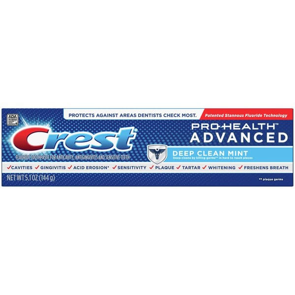 Starting from Day 1, Advance to Healthier Gums and Stronger Teeth* with Crest Pro-Health Advanced. This toothpaste contains ActivClean Crystals for advanced stain prevention. Crest Pro-Health Advanced Deep Clean Mint Toothpaste, like all Crest Pro-health toothpastes, cleans beyond what you can see and continues to work between brushings. It is made with patented stannous fluoride and provides clinically proven protection. It provides 8 advanced benefits in 1, including: protection against cavities, plaque and gingivitis, acid erosion†and tooth sensitivity for whole mouth health * vs. ordinary toothpaste with continued use. Starts fighting plaque and protecting enamel from Day 1. †Acid erosion effects: acids in everyday food can soften and thin enamel, leaving teeth less white, weaker and sensitive