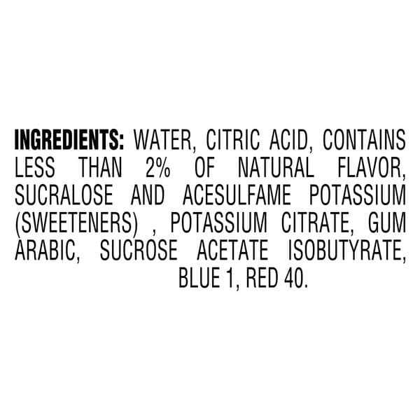Water, Malic Acid, Citric Acid, Propylene Glycol, Contains Less Than 2% Of Natural Flavor, Sucralose And Acesulfame Potassium (sweeteners), Potassium Citrate, Red 40, Blue 1, Potassium Sorbate (preservative).