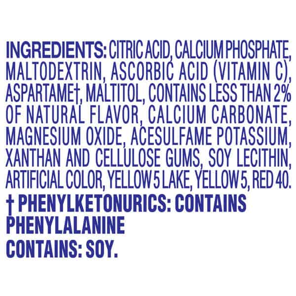 Citric Acid, Calcium Phosphate, Maltodextrin, Ascorbic Acid (vitamin C), Aspartamet, Maltitol, Contains Less Than 2% Of Natural Flavor, Calcium Carbonate, Magnesium Oxide. Acesulfame Potassium Xanthan And Cellulose Gums. Soy Lecithin Artificial Color, Yellow 5 Lake, Yellow 5, Red 40.