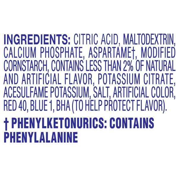 Citric Acid, Maltodextrin, Calcium Phosphate, Aspartame†, Modified Cornstarch, Contains Less Than 2% Of Natural And Artificial Flavor, Potassium Citrate, Acesulfame Potassium, Salt, Artificial Color, Red 40, Blue 1, Bha (to Help Protect Flavor), †Phenylketonurics: Contains Phenylalanine
