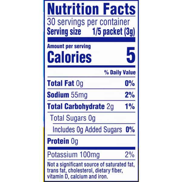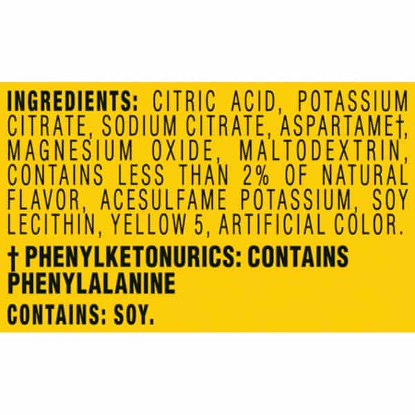 Citric Acid, Potassium Citrate, Sodium Citrate, Aspartame†, Magnesium Oxide, Maltodextrin, Contains Less Than 2% Of Natural Flavor, Acesulfame Potassium, Soy Lecithin, Yellow 5, Artificial Color, †Phenylketonurics: Contains Phenylalanine