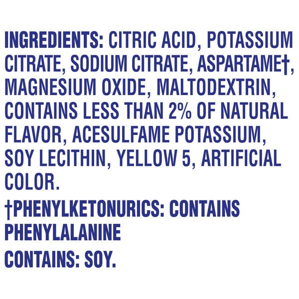 Citric Acid, Potassium Citrate, Sodium Citrate, Aspartame†, Magnesium Oxide, Maltodextrin, Contains Less Than 2% Of Natural Flavor, Acesulfame Potassium, Soy Lecithin, Yellow 5, Artificial Color, †phenylketonurics: Contains Phenylalanine