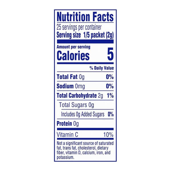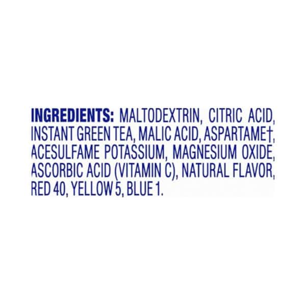 Maltodextrin, Citric Acid, Instant Green Tea, Malic Acid, Aspartame*, Acesulfame Potassium, Contains Less Than 2% Of Natural Flavor, Ascorbic Acid (vitamin C), Magnesium Oxide, Artificial Color, Red 40, Blue 1, Yellow 5.