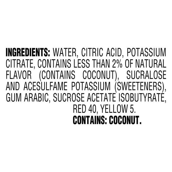 Water, Citric Acid, Potassium Citrate, Contains Less Than 2% Of Natural Flavor (contains Coconut), Sucralose And Acesulfame Potassium (sweeteners), Gum Arabic, Sucrose Acetate Isobutyrate, Red 40, Yellow 5