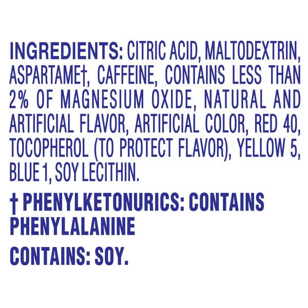 Citric Acid, Maltodextrin, Aspartame?, Caffeine, Contains Less Than 2% Of Natural And Artificial Flavor, Magnesium Oxide, Artificial Color, Red 40, Yellow 5, Blue 1, Soy Lecithin, Tocopherol (to Protect Flavor).