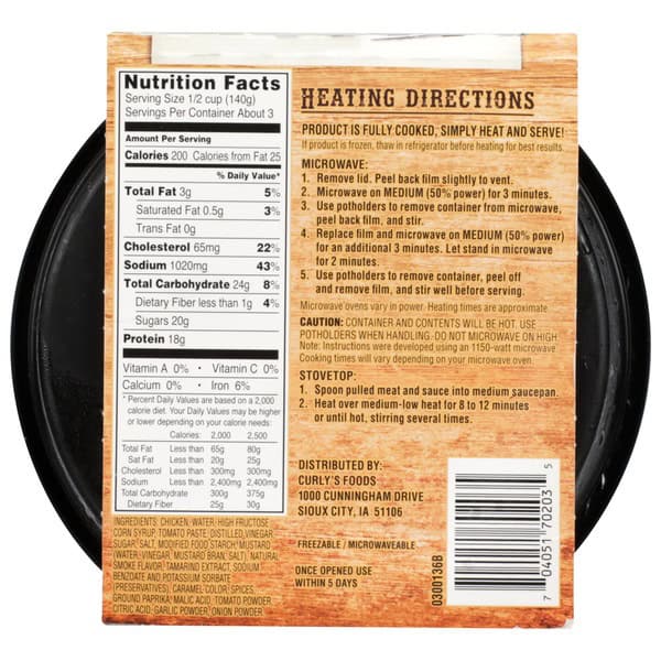 Heating Directions: Product is fully cooked, simply heat and serve! If product is frozen, thaw in refrigerator before heating for best results. Microwave: 1. Remove lid. Peel back film slightly to vent. 2. Microwave on medium (50% power) for 3 minutes. 3. Use potholders to remove container from microwave, peel back film, and stir. 4. Replace film and microwave on medium (50% power) for an additional 3 minutes. Let stand in microwave for 2 minutes. 5. Use potholders to remove container, peel off and remove film, and stir well before serving. Microwave ovens vary in power. Heating times are approximate. Caution: Container and contents will be hot. Use potholders when handling. Do not microwave on high. Note: Instructions were developed using an 1150-watt microwave. Cook times will vary depending on your microwave oven. Stovetop: 1. Spoon pulled meat and sauce into medium saucepan. 2. Heat over medium-low heat for 8 to 12 minutes or until hot, stirring several times.