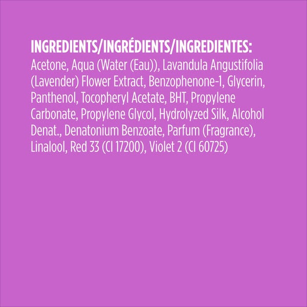 Acetone, Aqua/water, Lavandula Angustifolia (lavender) Flower Extract, Benzophenone-1, Glycerin, Panthenol, Tocopheryl Acetate, Hydrolyzed Silk, Bht, Propylene Glycol, Propylene Carbonate, Denatonium Benzoate, Fragrance, Linalool, Geraniol, Coumarin, Limonene, Ext. Violet 2 (ci 60730), Red 3 (ci 17200)