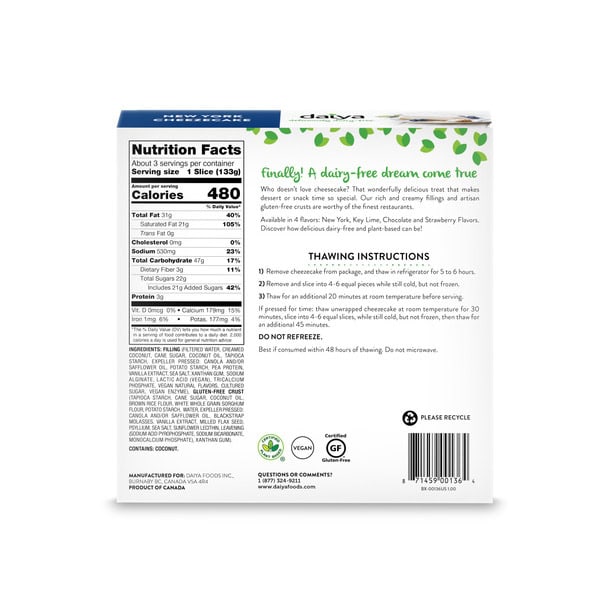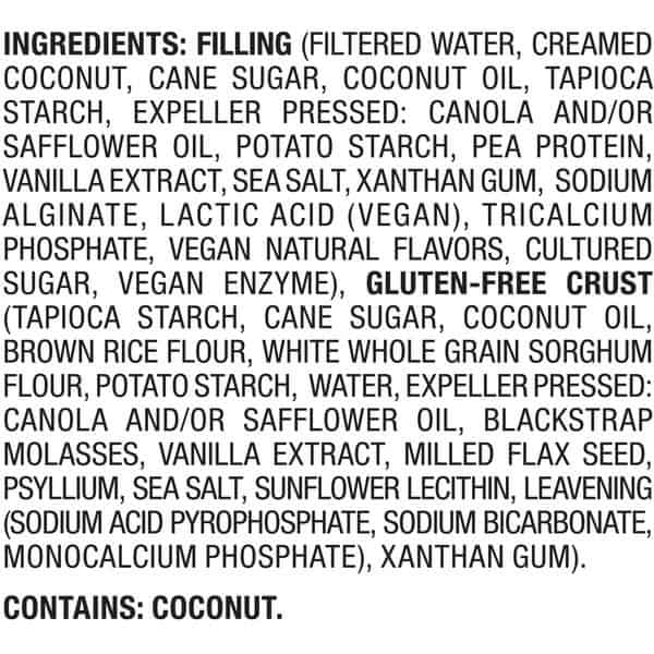 Filling (filtered Water, Creamed Coconut, Cane Sugar, Coconut Oil, Tapioca Starch, Expeller Pressed: Canola And/or Safflower Oil, Potato Starch, Pea Protein, Vanilla Extract, Sea Salt, Xanthan Gum, Sodium Alginate, Lactic Acid (vegan), Tricalcium Phosphate, Vegan Natural Flavors, Cultured Sugar, Vegan Enzyme), Gluten-free Crust (tapioca Starch, Cane Sugar, Coconut Oil, Brown Rice Flour, White Whole Grain Sorghum Flour, Potato Starch, Water, Expeller Pressed: Canola And/or Safflower Oil, Blackstrap Molasses, Vanilla Extract, Milled Flax Seed, Psyllium, Sea Salt, Sunflower Lecithin, Leavening (sodium Acid Pyrophosphate, Sodium Bicarbonate, Monocalcium Phosphate), Xanthan Gum)