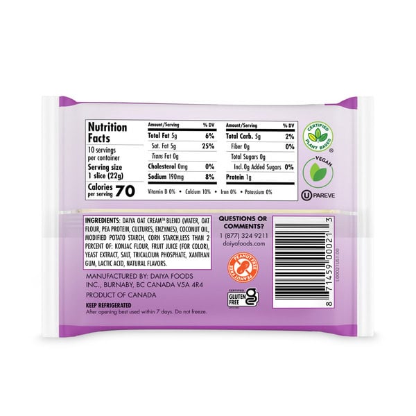 Daiya Oat Creamâ„¢ Blend (water, Gluten-free Oat Flour, Pea Protein, Cultures, Enzymes), Coconut Oil, Modified Potato Starch, Corn Starch, Less Than 2 Percent Of: Konjac Flour, Fruit Juice (for Color), Yeast Extract, Salt, Tricalcium Phosphate, Xanthangum, Lactic Acid, Natural Flavors