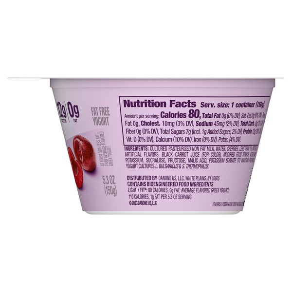 Looking for a gluten free, fat free yogurt with crave-able, sweet cherry flavor? Give your taste buds a reason to rejoice with a Dannon Light + Fit Cherry Fat Free Yogurt Cup. Every bite of this cherry flavored yogurt makes it easy to enjoy fat free snacks with this delicious light yogurt brand*. At Light + Fit, our goal is to help you do you while balancing a healthy diet by serving up delightfully creamy Greek yogurt with sensational flavor. Our fat free Greek yogurt comes in single serve cups, so you can live your life uninterrupted and enjoy them on the go. And with 80 calories and 12g of protein per 5.3 ounce serving, it’s a delicious option that can help you stick to a healthy routine. Pack a cup and enjoy it at work or as a post workout snack. Add some to parfaits or smoothies. Plus, these yogurt cups can transform into a bold, yummy whipped cream topping. Add some fierce flavor to your day, every day, with a single serving snack cup of Dannon Light + Fit Cherry Fat Free Yogurt. *At least 50% less fat than average flavored Greek yogurt; Light & Fit: 80 calories, 0g fat; Average flavored Greek yogurt: 110 calories, 1g fat per 5.3 oz serving