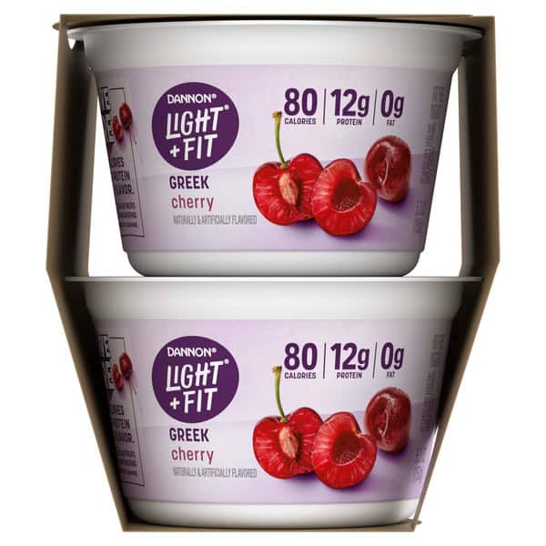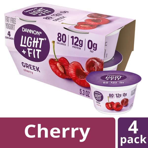 Looking for a delicious fat free yogurt with crave-able cherry flavor? Give your taste buds a reason to rejoice with a four-pack of Dannon Light + Fit Cherry Greek Fat Free Yogurt Cups. Every bite of this cherry flavored yogurt makes it easy to enjoy fat free snacks with this delicious light yogurt brand.* At Light + Fit, our goal is to help you do you while balancing a healthy diet by serving up some delightfully creamy Greek yogurt with sensational flavor. Our fat free Greek yogurt comes in single-serve cups, so you can live your life uninterrupted and enjoy them on the go. And with 80 calories and 12g of protein per 5.3 ounce serving, it’s a delicious, convenient option that can help you stick to a healthy routine. Pack a cup and enjoy it as a snack cup at work or as a post-workout snack. Or, you can add some to your breakfast parfaits and smoothies or use some in your favorite recipes as a flavorful sub for baking ingredients. Plus, these cherry flavored yogurt cups can transform into a bold, yummy whipped cream topping for desserts. Add fierce flavor to your day, every day, with a single serving snack cup in this Dannon Light + Fit Cherry Greek Fat Free Yogurt Pack. *At least 50% less fat than average flavored Greek yogurt; Light & Fit: 80 calories, 0g fat; Average flavored Greek yogurt: 110 calories, 1g fat per 5.3 oz serving