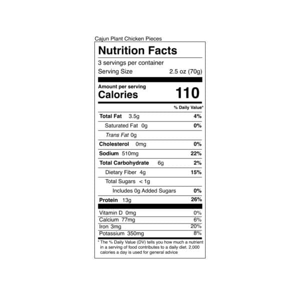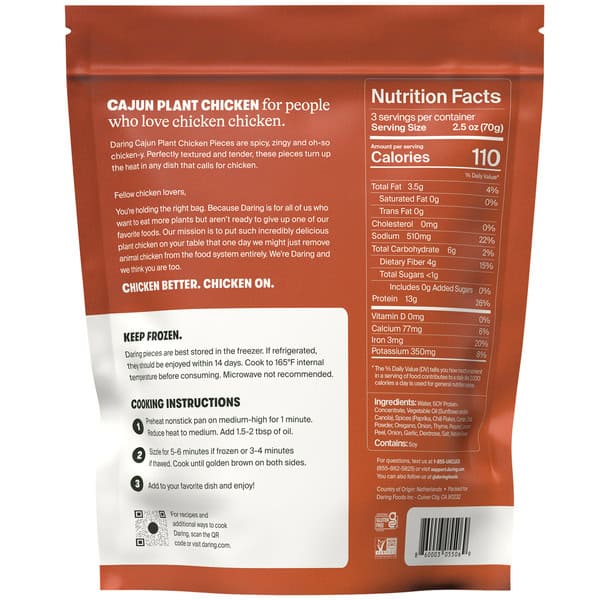Daring Cajun Plant Chicken Pieces are savory, juicy, and remarkably chicken-y. Made from a short list of simple ingredients, they cook in just 4 to 5 minutes (thawed) or 5 to 6 minutes (frozen). And with perfect texture and endless versatility, they work in just about any dish that calls for chicken. Not to mention, they’re non-GMO, gluten-free, with 13g of protein per serving.