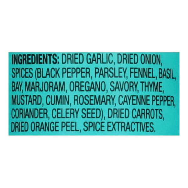 Garlic, Onion, Spices (black Pepper, Parsley, Fennel, Basil, Bay, Marjoram, Oregano, Savory, Thyme, Cayenne Pepper, Coriander, Cumin, Mustard, Rosemary, Celery Seed), Carrot, Orange Peel, Spice Extractives.