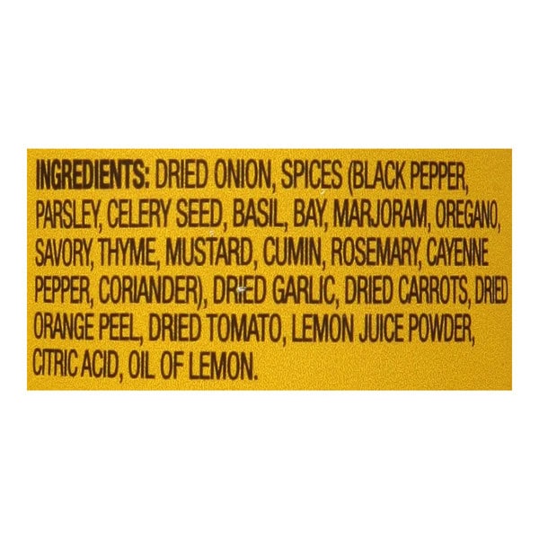 Dried Onion, Spices (black Pepper, Parsley, Celery Seed, Basil, Bay, Marjoram, Oregano, Savory, Thyme, Mustard, Cumin, Rosemary, Cayenne Pepper, Coriander), Dried Garlic, Dried Carrots, Dried Orange Peel, Dried Tomato, Lemon Juice Powder, Citric Acid, Oil Of Lemon.
