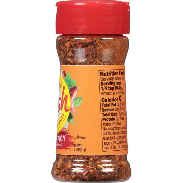 Flavor full. No MSG. A blend of crushed red chili pepper and spices with a zesty kick. Add a touch of heat to steak, chicken, burgers, vegetables, pasta, pizza, chili and your favorite egg dishes.
