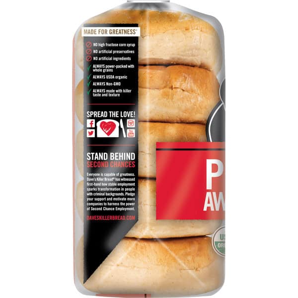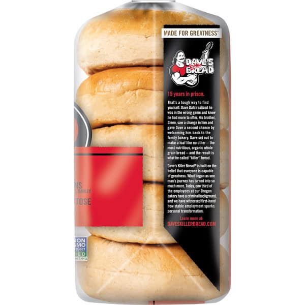 Dave’s Killer Bread® Plain Awesome® Bagels are USDA organic and Non-GMO Project Verified, making them a just plain awesome way to start your day. 15g whole grains and 10g of protein per serving. These soft and delicious plain organic bagels are baked with five super grains, including organic quinoa, spelt, rye, millet and barley—not to mention no high-fructose corn syrup, no artificial preservatives and no artificial ingredients. You can trust Dave’s Killer Bread® to deliver killer taste, texture and whole grain nutrition. Plain Awesome® bagels are pre-sliced and just what you need for easy mornings, hearty breakfast sandwiches and meals on the go. The story of Dave’s Killer Bread® began at the Portland Farmers Market, when Dave Dahl and his nephew brought some loaves of Dave’s bread to sell. For Dave, this marked the beginning of a new chapter in his life. Though he grew up in a family of bakers, his life took a different path. A path that landed him in prison for 15 years. Determined to prove his worth and make a positive impact, Dave worked tirelessly to bake breads that tasted unlike anything else on the market — packed with seeds and grains, made with only the very best organic and Non-GMO Project Verified ingredients. Dave’s Killer Bread® believes everyone is capable of greatness. One in three of the company’s employee partners at their Milwaukie, OR bakery has a criminal background—but your past doesn’t define your future. As a proud Second Chance Employer, Dave’s Killer Bread® truly believes everyone deserves a second chance to become a Good Seed.