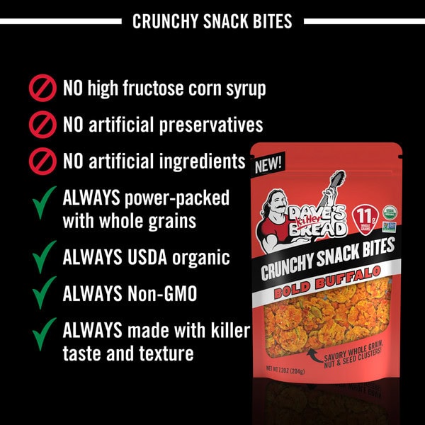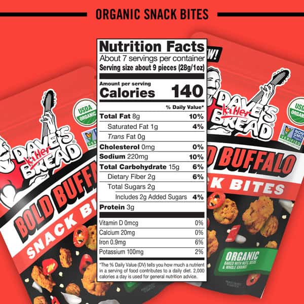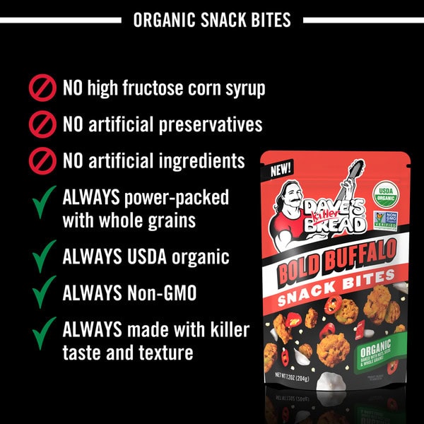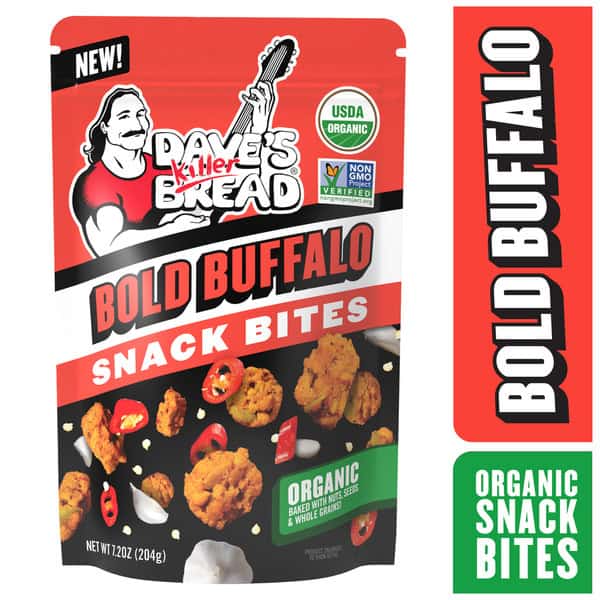 • You’ll get one 7.2 oz resealable bag of Dave’s Killer Bread Bold Buffalo Organic Snack Bites
