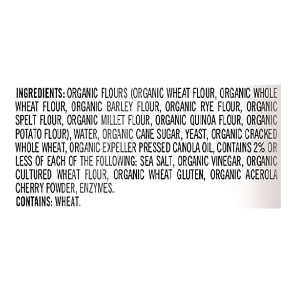 Organic Flours (organic Wheat Flour, Organic Whole Wheat Flour, Organic Barley Flour, Organic Rye Flour, Organic Spelt Flour, Organic Millet Flour, Organic Quinoa Flour, Organic Potato Flour), Water, Organic Cane Sugar, Organic Cracked Whole Wheat, Organic Expeller Pressed Canola Oil, Contains 2% Or Less Of Each Of The Following: Sea Salt, Organic Vinegar, Yeast, Organic Wheat Gluten, Organic Cultured Wheat Flour, Organic Acerola Cherry Powder, Enzymes
