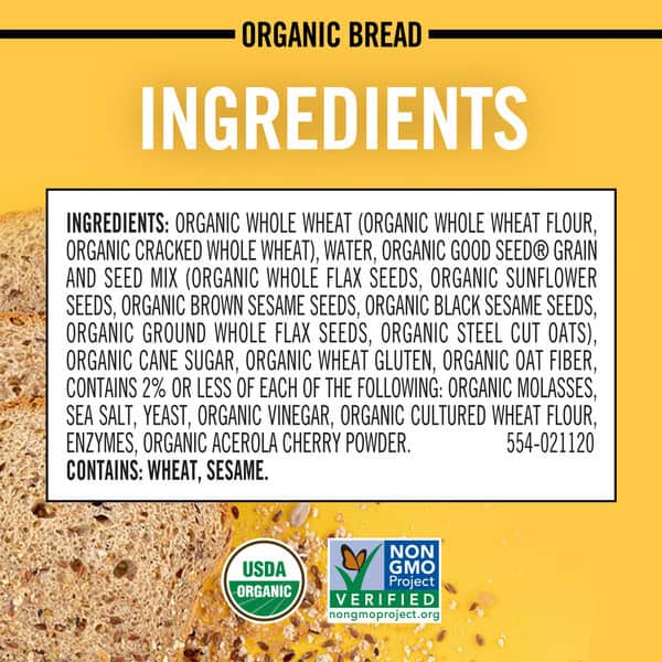 Organic Whole Wheat (organic Whole Wheat Flour, Organic Cracked Whole Wheat), Water, Good Seed Mix (organic Whole Flax Seeds, Organic Sunflower Seeds, Organic Ground Whole Flax Seeds, Organic Un-hulled Brown Sesame Seeds, Organic Un-hulled Black Sesame Seeds), Organic Dried Cane Syrup (sugar), Organic Wheat Gluten, Organic Oat Fiber, Organic Steel Cut Oats, Organic Molasses, Sea Salt, Yeast, Organic Cultured Whole Wheat.
