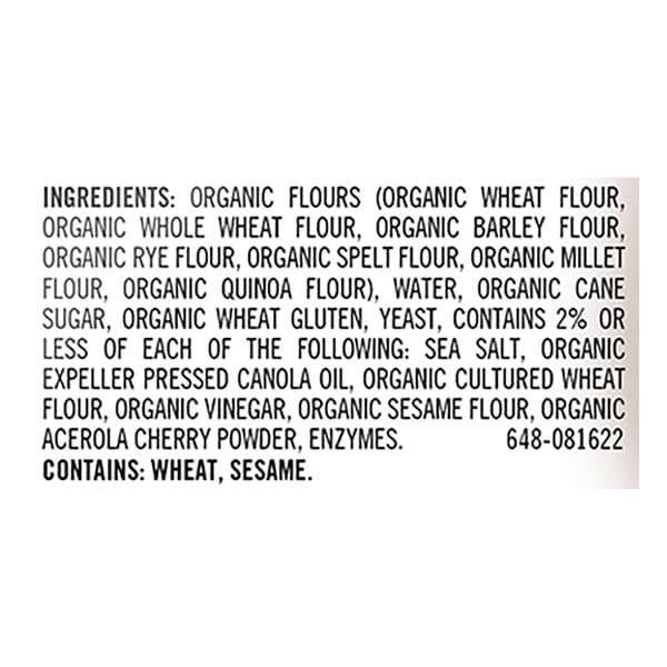 Organic Flours (organic Wheat Flour, Organic Whole Wheat Flour, Organic Barley Flour, Organic Rye Flour, Organic Spelt Flour, Organic Millet Flour, Organic Quinoa Flour), Water, Organic Cane Sugar, Organic Wheat Gluten, Yeast, Contains 2% Or Less Of Each Of The Following: Sea Salt, Organic Expeller Pressed Canola Oil, Organic Cultured Wheat Flour, Organic Vinegar, Organic Acerola Cherry Powder, Enzymes