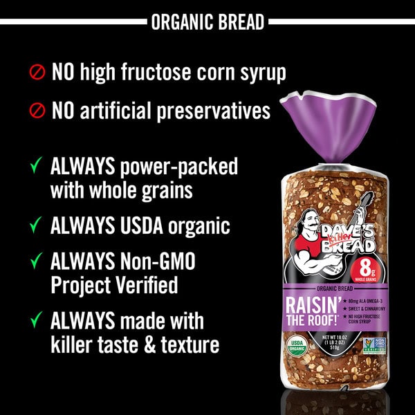 • You’ll get an 18 oz. loaf of sliced Dave’s Killer Bread® Raisin’ The Roof!® breakfast bread