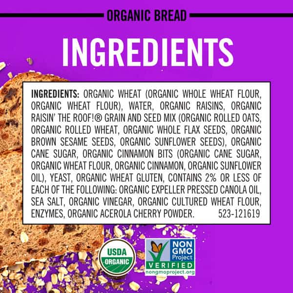 Organic Wheat (organic Whole Wheat Flour, Organic Wheat Flour), Water, Organic Raisins, Organic Cinnamon Bites (organic Sugar, Organic Wheat Flour, Organic Cinnamon, Organic Sunflower Oil), Organic Wheat Gluten, Organic Cane Sugar, Organic Raisin Bread Topping (organic Rolled Wheat, Organic Thick Rolled Oats, Organic Whole Flax Seed, Organic Sunflower Seed, Organic Un-hulled Brown Sesame Seed), Yeast, Organic Expeller Pressed Canola Oil, Salt, Organic Cultured Wheat, Wheat Enzymes, Organic Vinegar.