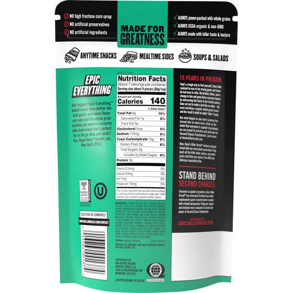Baked with organic nuts, grains and seeds and bold everything flavor, Dave’s Killer Bread® Epic Everything(TM) Organic Snack Bites satisfy your savory snack cravings while packing the whole grain nutrition you expect from Dave’s Killer Bread. Crunchy, bite-sized organic snacks in a resealable bag are perfect for an on-the-go snack. Epic Everything Snack Bites are USDA organic and baked with a killer mix of seeds, nuts, grains and savory everything flavor. These organic snack bites pack bold onion and garlic-y everything flavor in a perfectly poppable and portable form. Plus, each serving of Non-GMO Project Verified organic snack bites includes 10g of whole grains and is sure to take your snack to the next level. Dave’s Killer Bread Organic Snack Bites have no high fructose corn syrup, no artificial preservatives and no artificial ingredients. You can trust Dave’s Killer Bread to deliver killer taste, texture and whole grain nutrition.