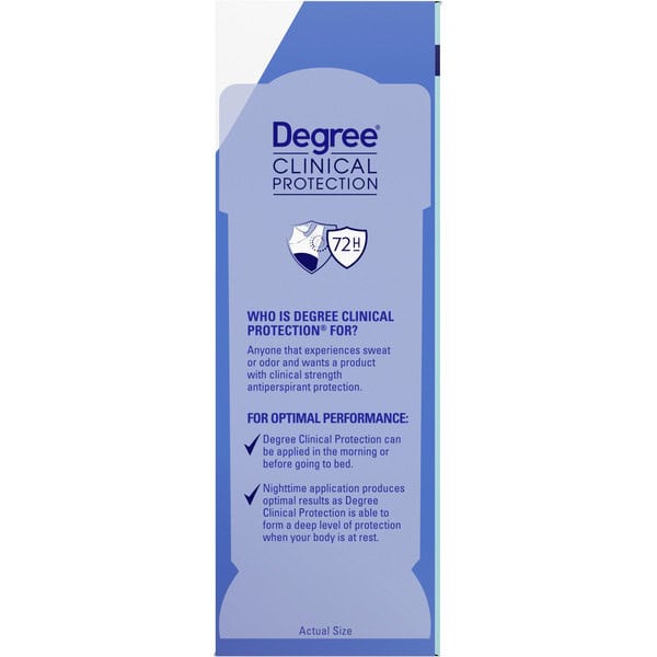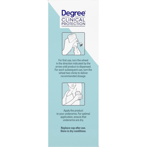 Degree Clinical Protection Shower Clean Antiperspirant Deodorant delivers prescription-strength wetness protection, so you can face the day with confidence. This antiperspirant for women features 72-hour sweat and odor protection and the bright floral scent of rose and jasmine, blended with delicate fruit for an invigorating, clean feeling. Only Degree has MotionSense technology that moves in sync with your body. This clinical strength antiperspirant deodorant releases a burst of subtle fragrance every time you move, for nonstop protection. Degree Clinical Protection Shower Clean Antiperspirant Deodorant keeps you feeling fresher, drier, and more confident. This powerful antiperspirant deodorant responds when you need it most so that you don’t have to worry about slowing down. Simply swipe and start moving. This antiperspirant deodorant for women with a tantalizing scent gives you the confidence to keep moving all day long. Degree Clinical Protection Shower Clean Antiperspirant Deodorant keeps you feeling cool, fresh and protected from sweat and odor. Degree gives you the confidence to keep moving, however you move. At Degree, we want to inspire the confidence in everyone to move more and go further. We’re here to support  your journey through an antiperspirant that moves with you and helps you go beyond your limits. As well as increasing our use of reusable materials, we’re making it easier for you to recycle our antiperspirant and dry spray packaging. Degree. It won’t let you down.