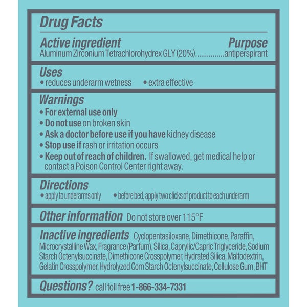 Directions: Apply to underarms only. Before bed, apply two clicks of product to each underarm. For first use, turn the wheel in the direction indicated by the arrow until product is dispensed. For each subsequent use, turn the wheel two clicks to deliver recommended dosage. Apply the product to your underarms. For optimal application, ensure that underarms are dry.