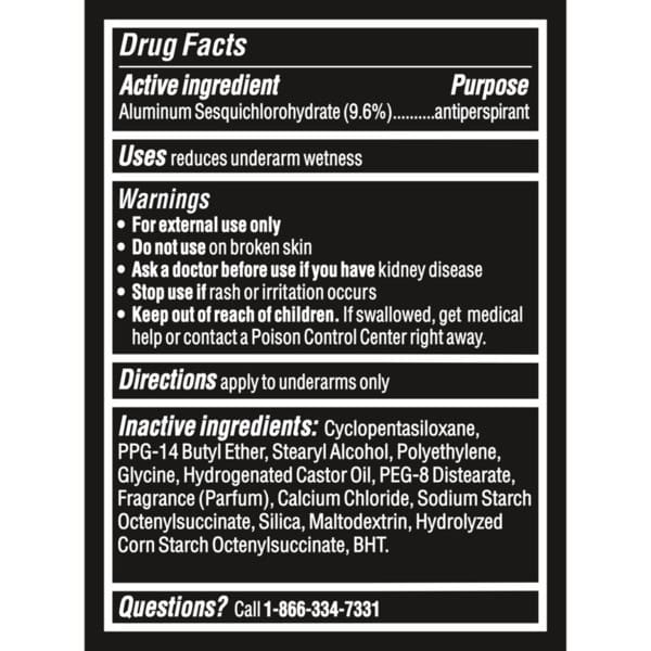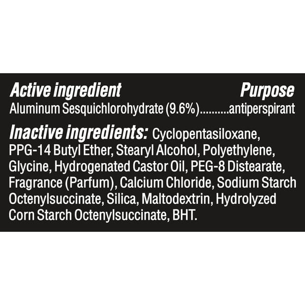Inactive Ingredients: Cyclopentasiloxane, Stearyl Alcohol, Ppg 14 Butyl Ether, Fragrance, Hydrogenated Castor Oil, Talc, Peg 8 Distearate, Caprylic/capric Triglyceride, Sodium Starch Octenylsuccinate, Hydrated Silica, Maltodextrin, Gelatin Crosspolymer, Hydrolyzed Corn Starch, Bht, Silica, Cellulose Gum