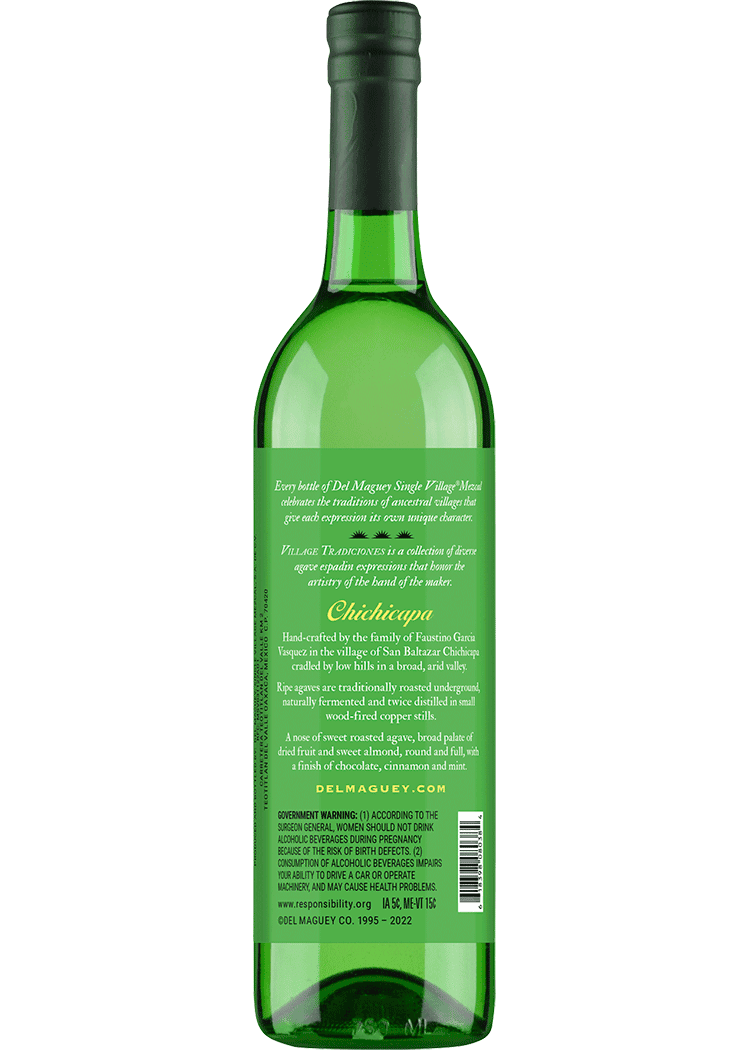 Mexico- Original Village Series. Handcrafted in San Balthazar Chichicapa, Oaxaca, located in a broad valley with a semitropical microclimate. Agave: Espadin. Nose of sweet roasted agave & toasted corn, palate of dried fruit & sweet almond, finish of bitter chocolate & mint.
