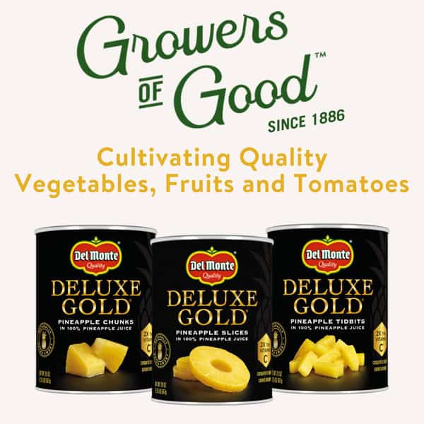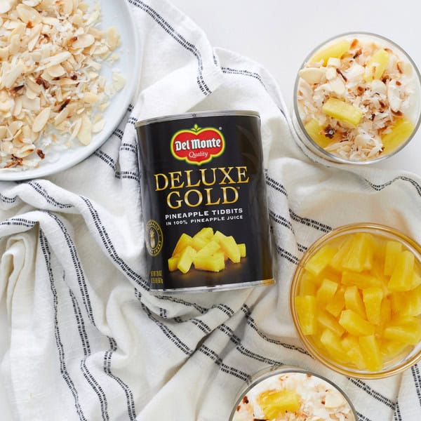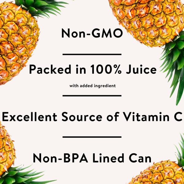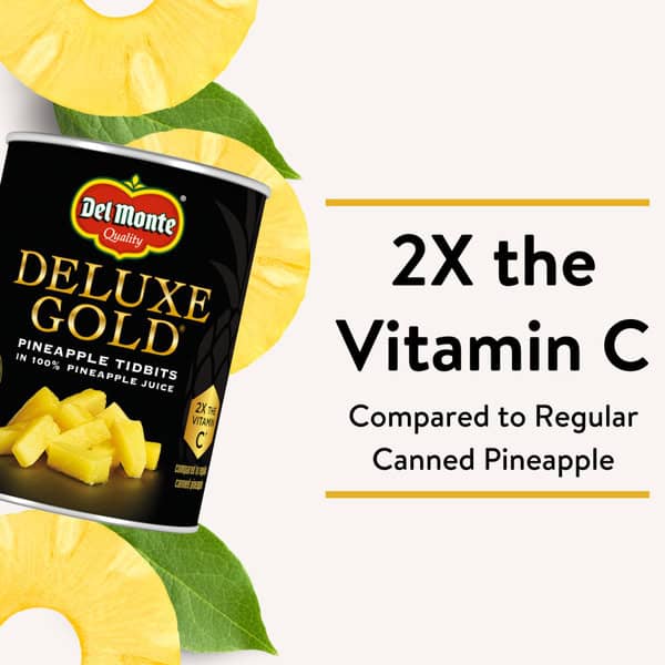 Del Monte Deluxe Gold Pineapple Tidbits in Juice 20 oz Can makes it easy to enjoy high quality fruit in minutes. Del Monte Deluxe Gold Pineapple Tidbits are packed in 100% Juice with added ingredient and contain 2x the Vitamin C compared to regular canned pineapple. Del Monte Canned Pineapple is non-GMO and packed in non-BPA lined cans making it a ready to eat fruit option you can feel good about. Del Monte Canned Pineapple is a great addition to a savory baked ham or pineapple upside down cake. Bring goodness to your table with Del Monte Canned Fruit.