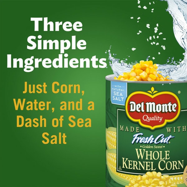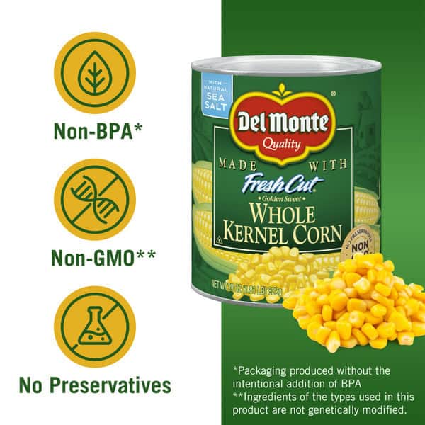 Brighten your plate with the vibrant goodness of DEL MONTE FRESH CUT Whole Kernel Corn. Picked at the peak of freshness and packed within hours, this canned sweet corn delivers the highest standard in rich, sweet flavor. This Non-GMO* canned corn contains no artificial preservatives and is seasoned with natural sea salt, making it a wholesome, ready to eat side dish and a flavorful addition to recipes. Mix DEL MONTE canned sweet corn with salsa and black beans to make a crowd-pleasing dip for tortilla chips, or add it to your favorite soup, stew or chili recipe. Each can is easy to store in a pantry or cabinet shelf for easy access whenever you need a delicious side dish in a hurry. Bring the natural goodness of the earth to your dinner table with DEL MONTE FRESH CUT canned vegetables. *Ingredients of the types used in this product are not genetically modified.