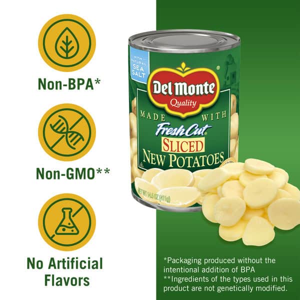 DEL MONTE FRESH CUT Sliced Canned Potatoes make it easy to prepare and enjoy high-quality potatoes at home in minutes. These DEL MONTE vegetables are picked at the peak of ripeness and packed within miles with just potatoes, water and a dash of natural sea salt. Nothing else. These sliced potatoes are Non-GMO*. Delicious and ready to use, these peeled and sliced potatoes are perfect as the start to your favorite stew, soup or casserole recipes or as a simple side for quick weeknight meals. Simply add them to your dishes or heat them to serve the potatoes as a side. Packaged in Non-BPA** cans, these DEL MONTE canned vegetables are easy to store and are always ready to use. Bring the natural goodness of the earth to your dinner table with DEL MONTE Can Potatoes. *Ingredients of the types used in this product are not genetically modified. **Packaging produced without the intentional addition of BPA.