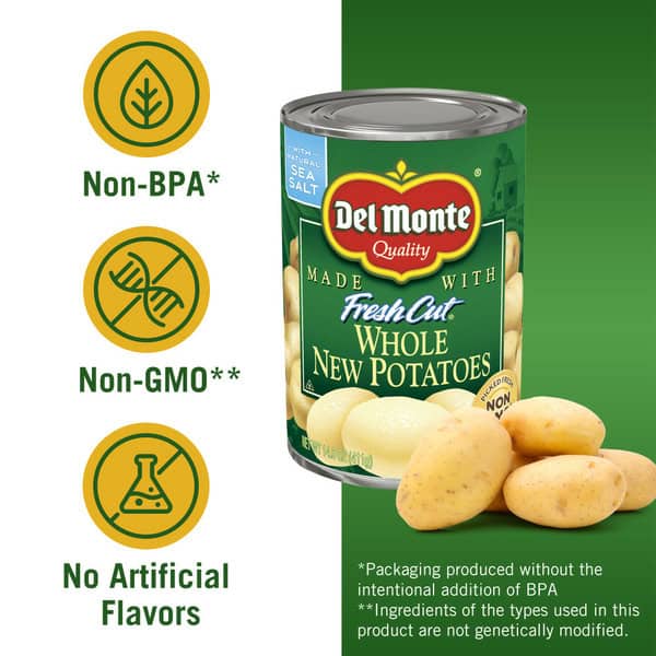 DEL MONTE FRESH CUT Whole New Canned Potatoes are made with the finest potatoes that are peeled and packed fresh to capture delicious flavor and essential nutrients. These Non-GMO* can potatoes are seasoned with natural sea salt, making them a wholesome, ready to eat side dish and a flavorful addition to recipes. Delicious at any meal, DEL MONTE canned potatoes are perfect for making farm style sausage and potatoes or garlicky smashed potatoes, and they make a great addition to your favorite soups and stews. Each can of potatoes is easy to store in a pantry or cabinet for easy access whenever you need veggies in a hurry. Bring the natural goodness of the earth to your dinner table with DEL MONTE canned vegetables. *Ingredients of the types used in this product are not genetically modified.