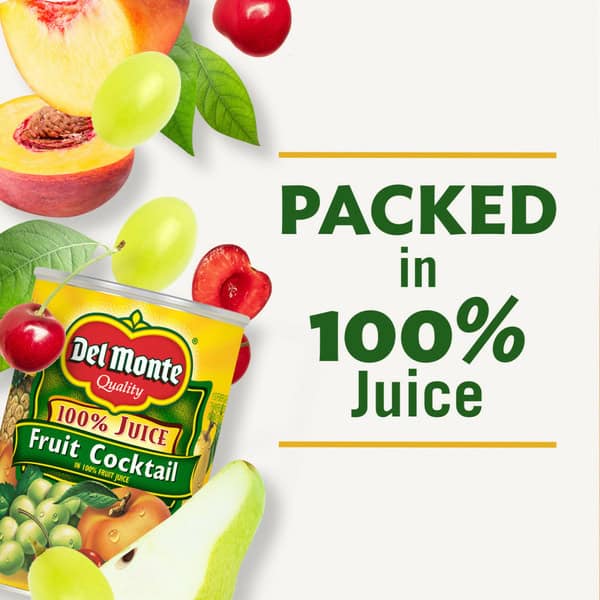 DEL MONTE Fruit Cocktail in 100% Fruit Juice makes it easy to enjoy high quality fruit in minutes. The canned fruit is packed with sweet peaches, juicy Bartlett pears, plump grapes, succulent pineapples and scrumptious cherries in fruit juice for a ready to eat fruit snack you can feel good about. DEL MONTE canned fruit cocktail contains no artificial preservatives, and has 1/3 fewer calories than fruit cocktail in heavy syrup,* making it a convenient, wholesome and ready to eat fruit option for busy nights. This Non-GMO** canned fruit is ideal as part of a quick lunch snack or for flavorful fruit salads. Each Non-BPA*** can is easy to open and stores well in a pantry or cabinet for a convenient fruit snack whenever you need delicious fruit on-the-go. Bring the wholesome goodness of the Earth to your family with DEL MONTE Fruit Cocktail. *Fruit Cocktail in 100% Juice 60 calories per serving; Fruit Cocktail in Heavy Syrup 100 calories per serving. **Ingredients of the types used in this product are not genetically modified. ***Packaging produced without the intentional addition of BPA.