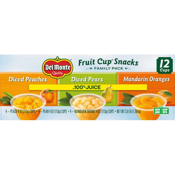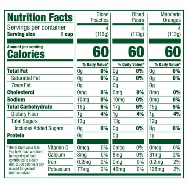 Diced Peaches – Peaches, White Grape Juice (water, White Grape Juice Concentrate), Ascorbic Acid, Lemon Juice Concentrate, Natural Flavors,diced Pears – Pears, White Grape Juice (water, White Grape Juice Concentrate), Ascorbic Acid, Natural Flavor, Lemon Juice Concentrate,mandarin Oranges – Mandarin Oranges, White Grape Juice (water, White Grape Juice Concentrate), Natural Flavors, Ascorbic Acid, Lemon Juice Concentrate