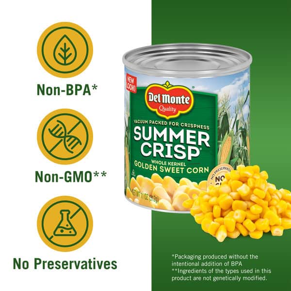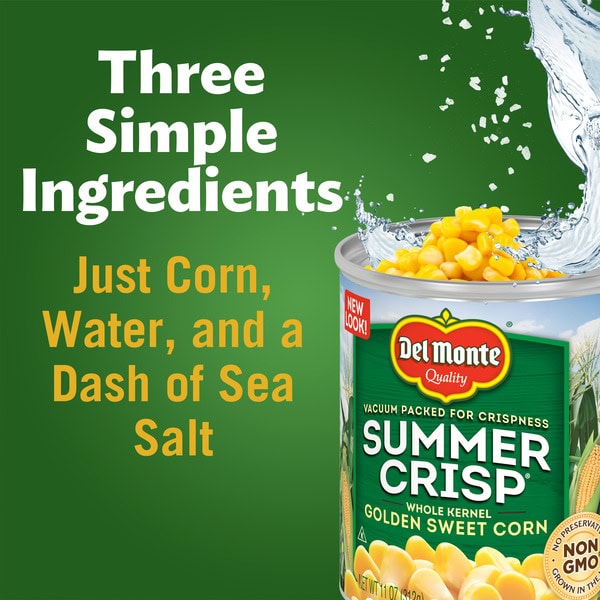Brighten your plate with the vibrant goodness of DEL MONTE SUMMER CRISP Whole Kernel Corn canned vegetables. Picked at the peak of freshness and packed within hours, this canned sweet corn delivers the highest standard in rich, sweet flavor. This non-GMO* canned corn contains no preservatives and is seasoned with natural sea salt, making it a wholesome, ready to eat side dish and a flavorful addition to recipes. Mix DEL MONTE canned sweet corn with salsa and black beans to make a crowd-pleasing dip for tortilla chips, or add it to your favorite soup, pasta or vegetable medley. Each non-BPA** can is easy to store in a pantry or cabinet shelf for easy access whenever you need a delicious ready to eat side dish in a hurry. Bring the natural goodness of the earth to your dinner table with DEL MONTE SUMMER CRISP canned vegetables. *Ingredients of the types used in this product are not genetically modified. **Packaging produced without the intentional addition of BPA.